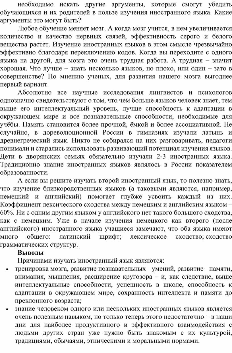 Если учащимся или их родителям задать вопрос: «Для чего изучать иностранные языки?», то, скорее всего, мы получим такие ответы: для путешествий, для общения с иностранцами, для чтения литературы и просмотра фильмов в оригинале. Достаточно ли это сильные мотивы изучать иностранные языки для современных школьников? Очевидно, что необходимо искать другие аргументы, которые смогут убедить обучающихся и их родителей в пользе изучения иностранного языка. Какие аргументы это могут быть?