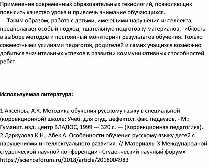 Таким образом, работа с детьми, имеющими нарушения интеллекта, предполагает особый подход, тщательную подготовку материалов, гибкость в выборе методов и постоянный мониторинг результатов обучения. Только совместными усилиями педагогов, родителей и самих учащихся возможно добиться значительных успехов в развитии коммуникативных способностей ребят.