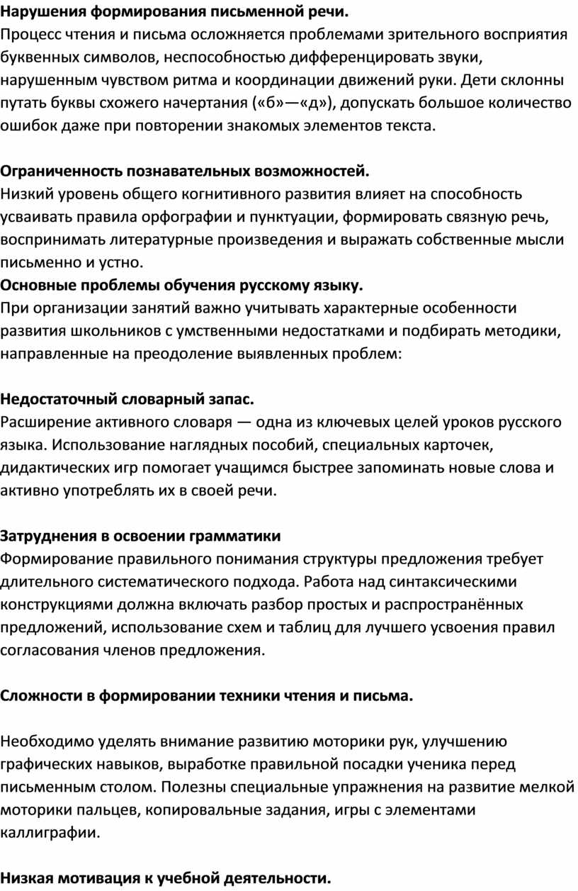 Проблема обучения русскому языку школьников речевыми нарушениями является сложной и многогранной. В силу особенностей психофизического развития умственно отсталые дети с большим трудом воспринимают и усваивают правила и понятия русского языка. Зачастую у них выявляется недостаточный уровень развития словесно логического мышления, операций абстрагирования.