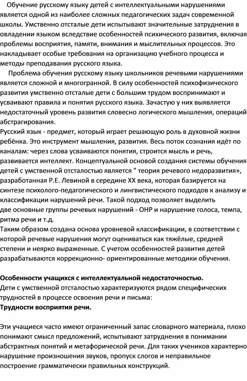 ребёнка. Это инструмент мышления, развития. Весь поток сознания идёт по каналам: через слова усваиваются понятия, строится мысль и речь, развивается интеллект. Концептуальной основой создания системы обучения детей с умственной отсталостью является " теория речевого недоразвития», разработанная Р.Е. Левиной в середине XX века, которая базируется на синтезе психолого-педагогического и лингвистического подходов к анализу и классификации нарушений речи. Такой подход позволяет выделить