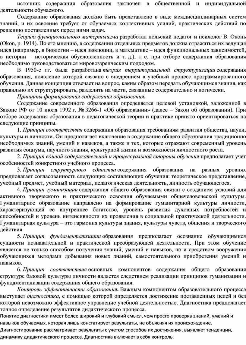 Теорию функционального материализма разработал польский педагог и психолог В. Оконь (Okon, р. 1914). По его мнению, в содержании отдельных предметов должна отражаться их ведущая идея (например, в биологии – идея эволюции, в математике – идея функциональных зависимостей, в истории – историческая обусловленность и т. д.), т. е. при отборе содержания образования необходимо руководствоваться мировоззренческим подходом.