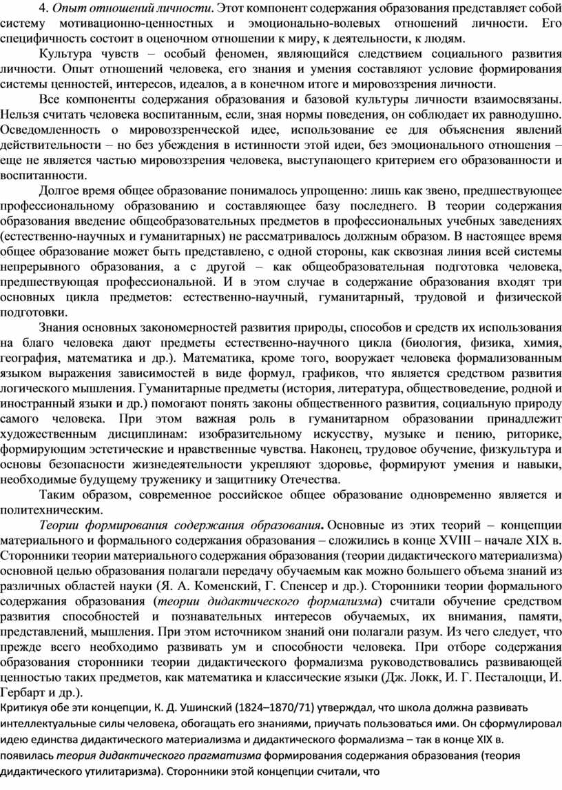 Критикуя обе эти концепции, К. Д. Ушинский (1824–1870/71) утверждал, что школа должна развивать интеллектуальные силы человека, обогащать его знаниями, приучать пользоваться ими. Он сформулировал идею единства дидактического материализма и дидактического формализма – так в конце XIX в. появилась теория дидактического прагматизма формирования содержания образования (теория дидактического утилитаризма). Сторонники этой концепции считали, что источник содержания образования заключен в общественной и индивидуальной деятельности обучаемого.