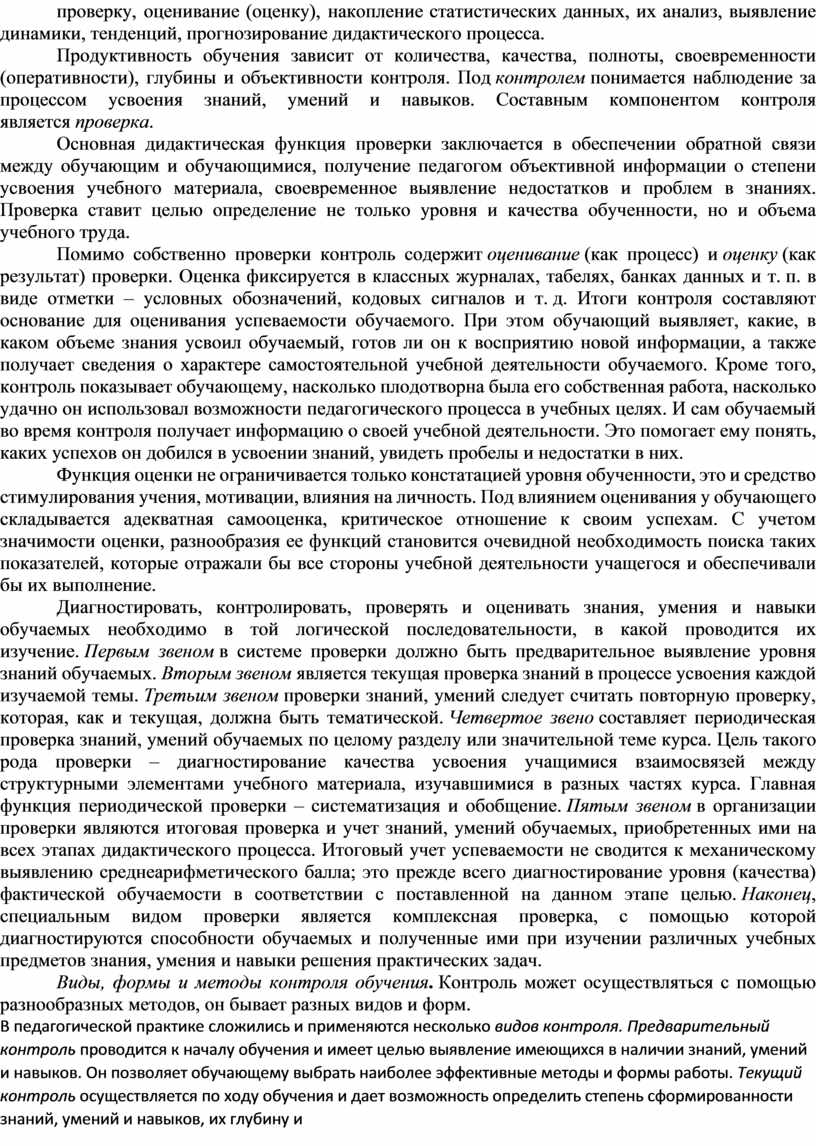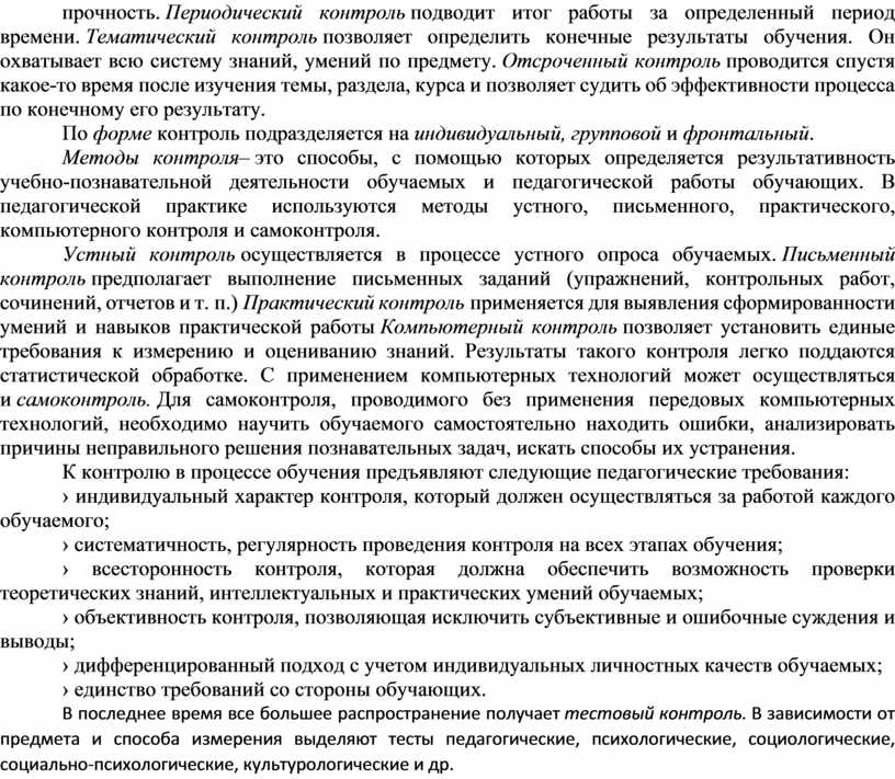 В педагогической практике сложились и применяются несколько видов контроля. Предварительный контроль проводится к началу обучения и имеет целью выявление имеющихся в наличии знаний, умений и навыков. Он позволяет обучающему выбрать наиболее эффективные методы и формы работы. Текущий контроль осуществляется по ходу обучения и дает возможность определить степень сформированности знаний, умений и навыков, их глубину и прочность. Периодический контроль подводит итог работы за определенный период времени. Тематический контроль позволяет определить конечные результаты обучения. Он охватывает всю систему знаний, умений по предмету. Отсроченный контроль проводится спустя какое-то время после изучения темы, раздела, курса и позволяет судить об эффективности процесса по конечному его результату.