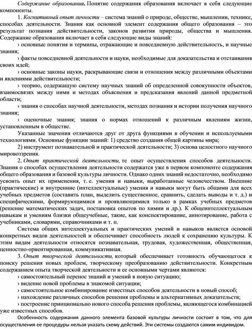 Содержание образования. Понятие содержания образования включает в себя следующие компоненты.