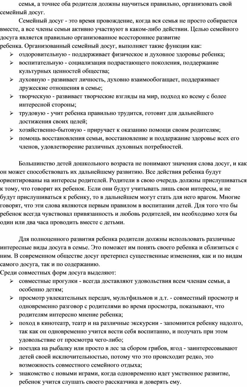 Большинство детей дошкольного возраста не понимают значения слова досуг, и как он может способствовать их дальнейшему развитию. Все действия ребенка будут ориентированы на интересы родителей. Родители в свою очередь должны прислушиваться к тому, что говорит их ребенок. Если они будут учитывать лишь свои интересы, и не будут прислушиваться к ребенку, то в дальнейшем могут стать для него врагом. Многие говорят, что эти слова являются первым правилом в воспитании детей. Для того что бы ребенок всегда чувствовал привязанность и любовь родителей, им необходимо хотя бы один или два часа проводить вместе с детьми.