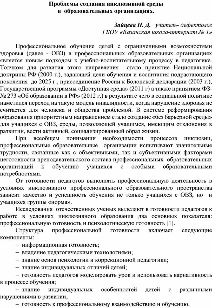 При всеобщем понимании необходимости процессов инклюзии, профессиональные образовательные организации испытывают значительные трудности, связанные как с объективными, так и субъективными факторами неготовности преподавательского состава профессиональных образовательных организаций к обучению учащихся с особыми образовательными потребностями.