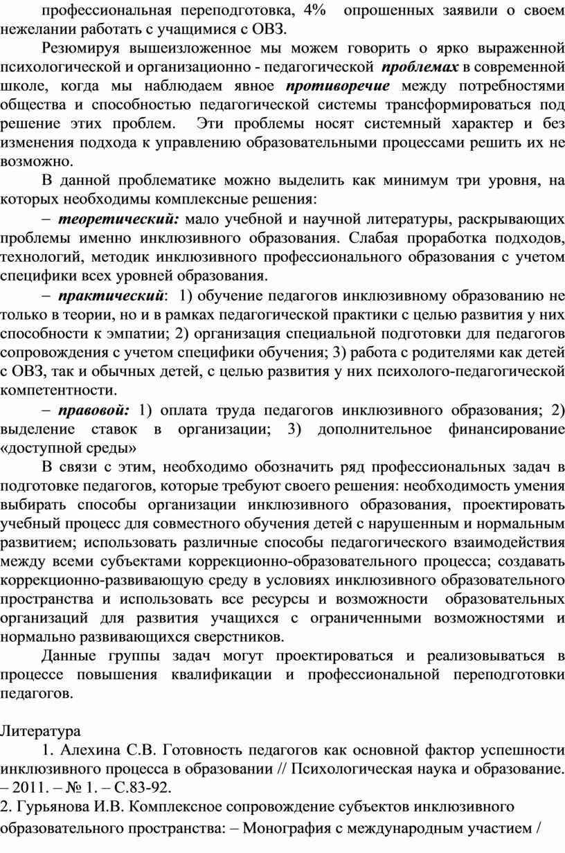 1. Алехина С.В. Готовность педагогов как основной фактор успешности инклюзивного процесса в образовании // Психологическая наука и образование. – 2011. – № 1. – С.83-92.