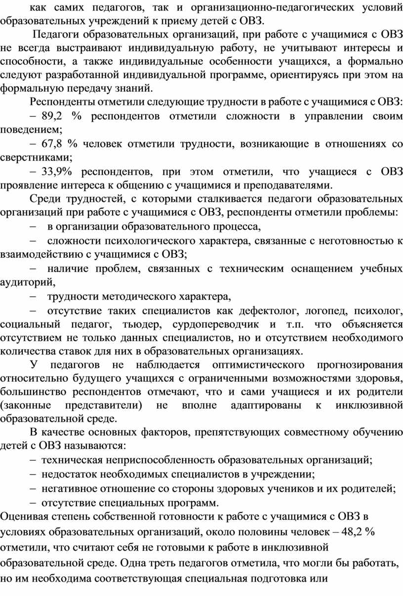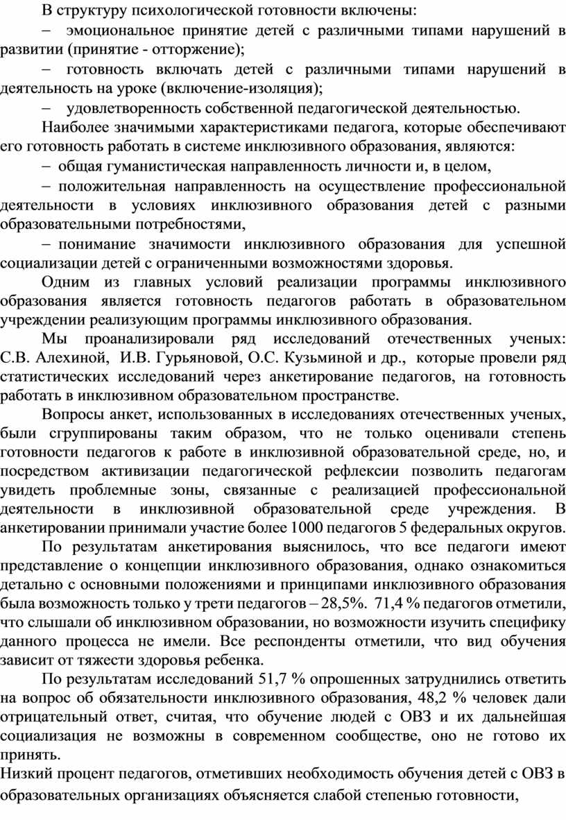 Мы проанализировали ряд исследований отечественных ученых: С.В. Алехиной, И.В. Гурьяновой, О.С. Кузьминой и др., которые провели ряд статистических исследований через анкетирование педагогов, на готовность работать в инклюзивном образовательном пространстве.