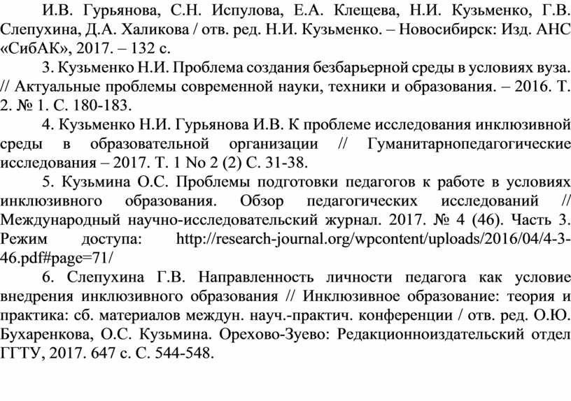 5. Кузьмина О.С. Проблемы подготовки педагогов к работе в условиях инклюзивного образования. Обзор педагогических исследований // Международный научно-исследовательский журнал. 2017. № 4 (46). Часть 3. Режим доступа: http://research-journal.org/wpcontent/uploads/2016/04/4-3-46.pdf#page=71/