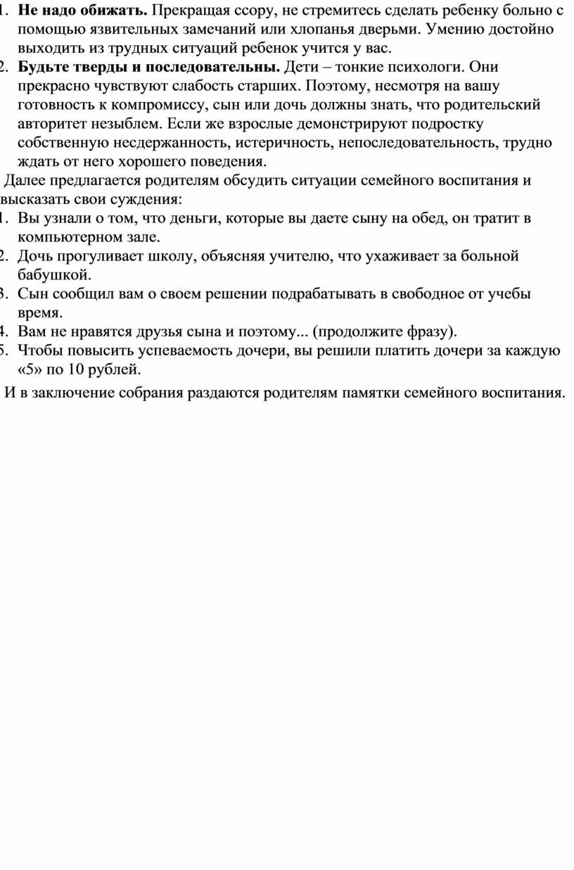 Далее предлагается родителям обсудить ситуации семейного воспитания и высказать свои суждения: