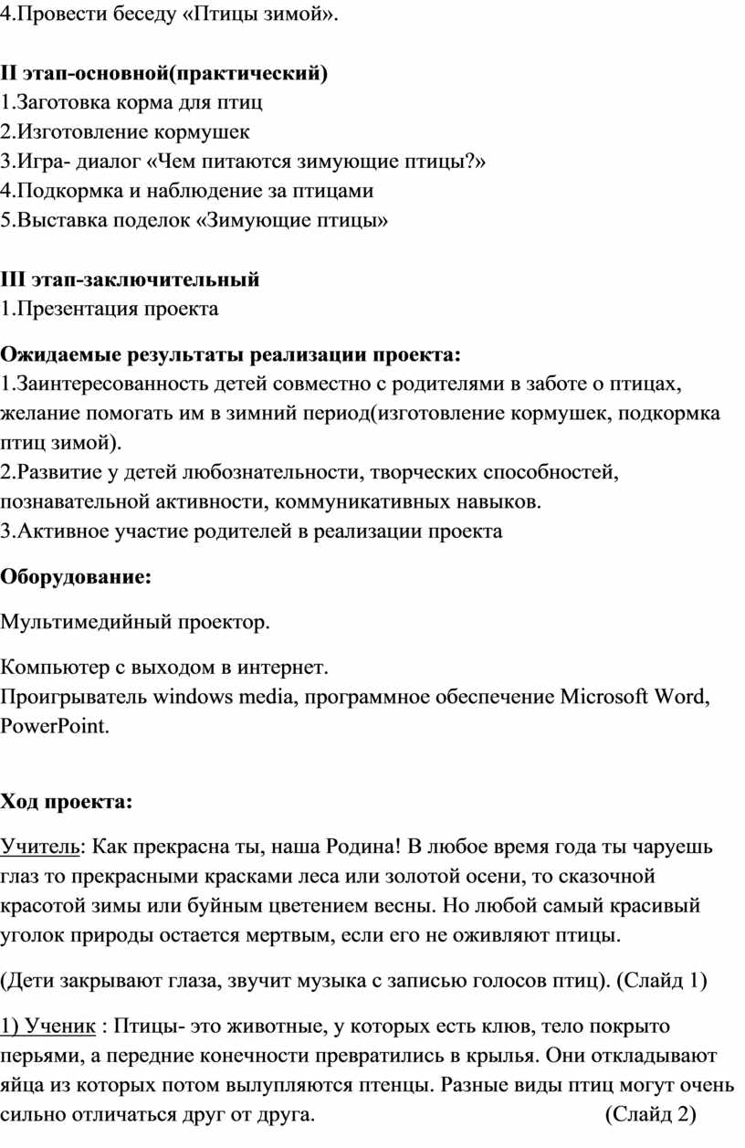 период(изготовление кормушек, подкормка птиц зимой).