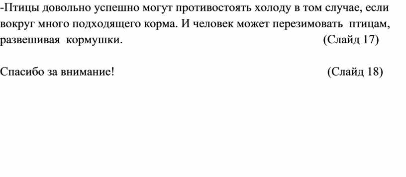 -Птицы довольно успешно могут противостоять холоду в том случае, если вокруг много подходящего корма. И человек может перезимовать птицам, развешивая кормушки. (Слайд 17)