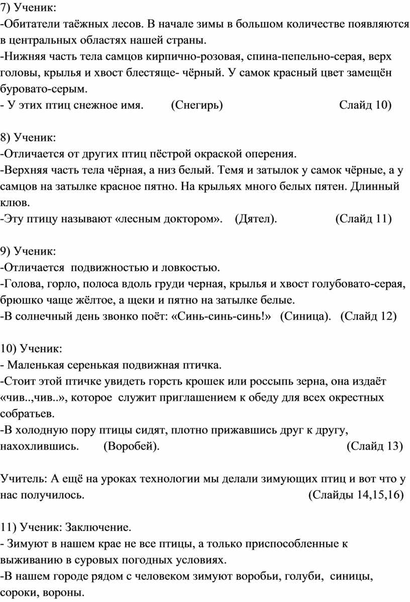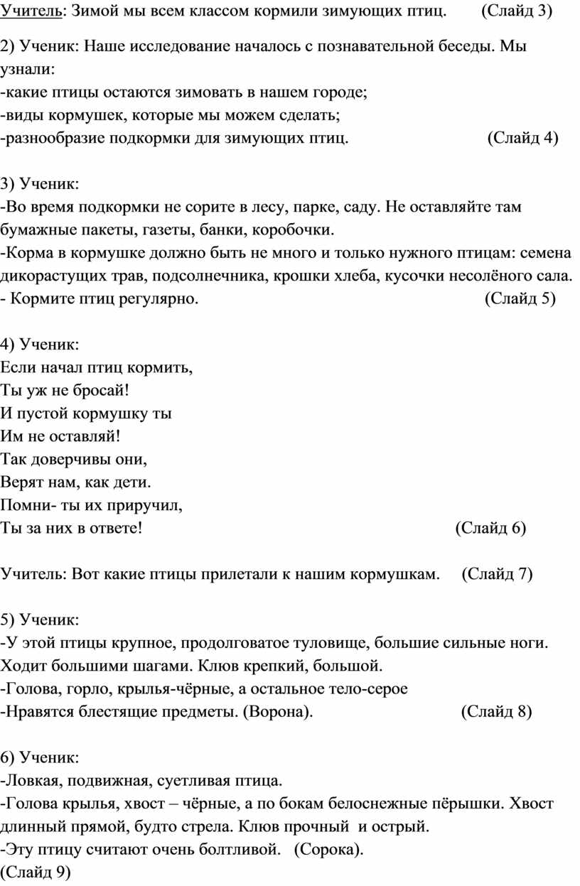 Учитель: Зимой мы всем классом кормили зимующих птиц. (Слайд 3)