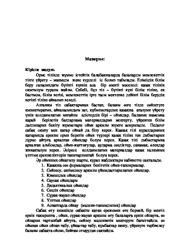 Алғашқы тіл сабақтарынан бастап, баланы өзге тілде сөйлетуге қызықтыратын, айналасындағы зат, құбылыстардың қазақша аталуын үйрету үшін қолданылатын ыңғайлы әдістердің бірі – ойындар.