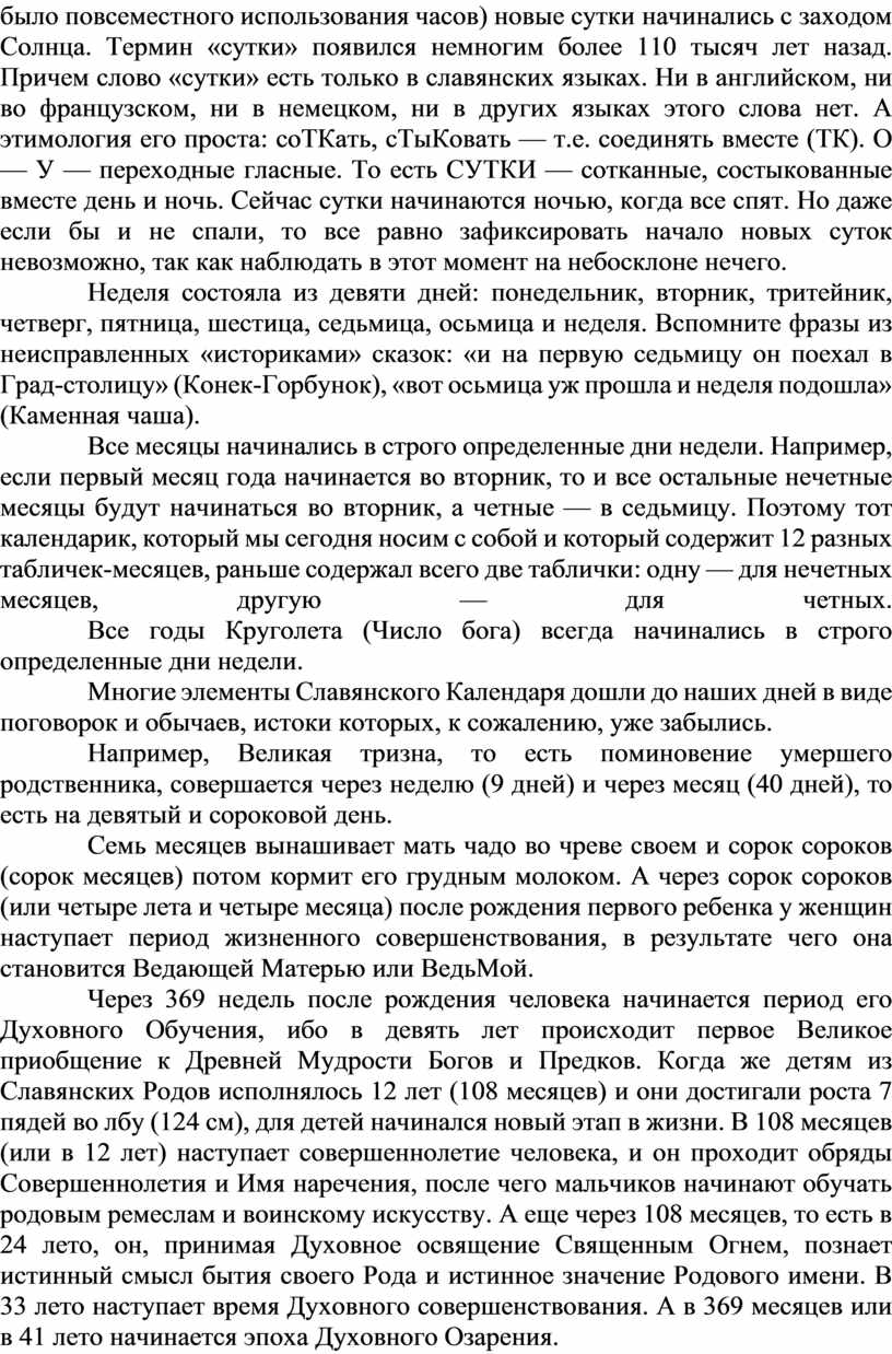 Неделя состояла из девяти дней: понедельник, вторник, тритейник, четверг, пятница, шестица, седьмица, осьмица и неделя. Вспомните фразы из неисправленных «историками» сказок: «и на первую седьмицу он поехал в Град-столицу» (Конек-Горбунок), «вот осьмица уж прошла и неделя подошла» (Каменная чаша).