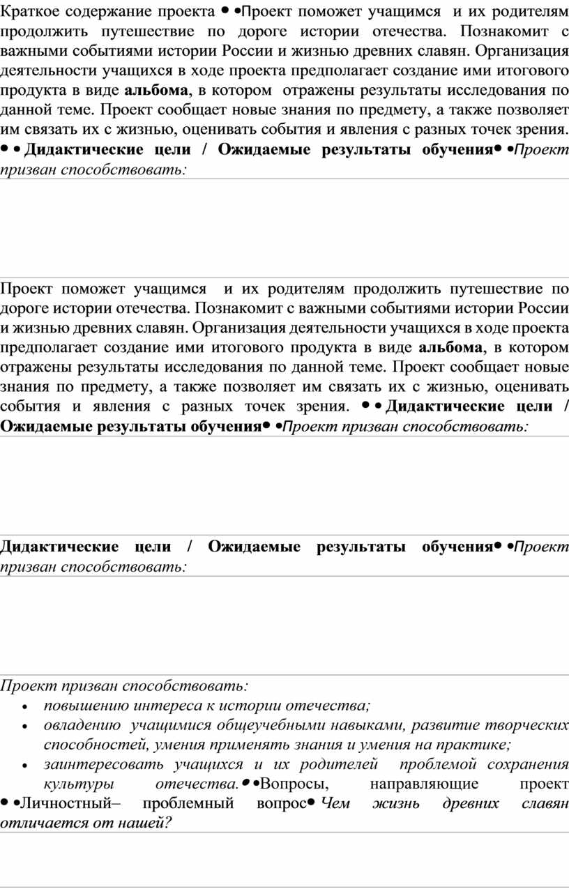Проект поможет учащимся и их родителям продолжить путешествие по дороге истории отечества. Познакомит с важными событиями истории России и жизнью древних славян. Организация деятельности учащихся в ходе проекта предполагает создание ими итогового продукта в виде альбома, в котором отражены результаты исследования по данной теме. Проект сообщает новые знания по предмету, а также позволяет им связать их с жизнью, оценивать события и явления с разных точек зрения. |