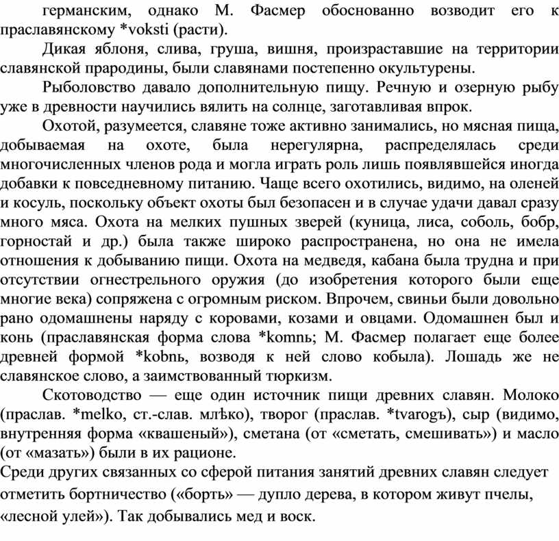 Охотой, разумеется, славяне тоже активно занимались, но мясная пища, добываемая на охоте, была нерегулярна, распределялась среди многочисленных членов рода и могла играть роль лишь появлявшейся иногда добавки к повседневному питанию. Чаще всего охотились, видимо, на оленей и косуль, поскольку объект охоты был безопасен и в случае удачи давал сразу много мяса. Охота на мелких пушных зверей (куница, лиса, соболь, бобр, горностай и др.) была также широко распространена, но она не имела отношения к добыванию пищи. Охота на медведя, кабана была трудна и при отсутствии огнестрельного оружия (до изобретения которого были еще многие века) сопряжена с огромным риском. Впрочем, свиньи были довольно рано одомашнены наряду с коровами, козами и овцами. Одомашнен был и конь (праславянская форма слова *komnь; М. Фасмер полагает еще более древней формой *kobnь, возводя к ней слово кобыла). Лошадь же не славянское слово, а заимствованный тюркизм.