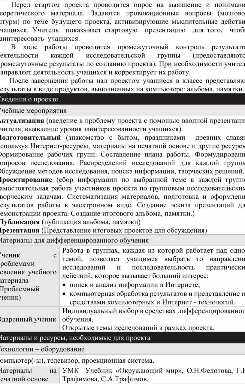 Актуализация (введение в проблему проекта с помощью вводной презентации учителя, выявление уровня заинтересованности учащихся) Подготовительный (знакомство с бытом, праздниками древних славян, используя Интернет-ресурсы, материалы на печатной основе и другие ресурсы. Формирование рабочих групп. Составление плана работы. Формулирование вопросов исследования. Распределений исследований для каждой группы. Обсуждение методов исследования, поиска информации, творческих решений.) Проектирование (сбор информации по выбранной теме в каждой группе, самостоятельная работа участников проекта по групповым исследовательским, творческим задачам. Систематизация материалов, подготовка и оформление результатов работы в электронном виде. Создание эскиза презентаций для демонстрации проекта. Создание итогового альбома, памятки.) Публикация (публикация альбома, памятки) Презентация (Представление итоговых проектов для обсуждения) |