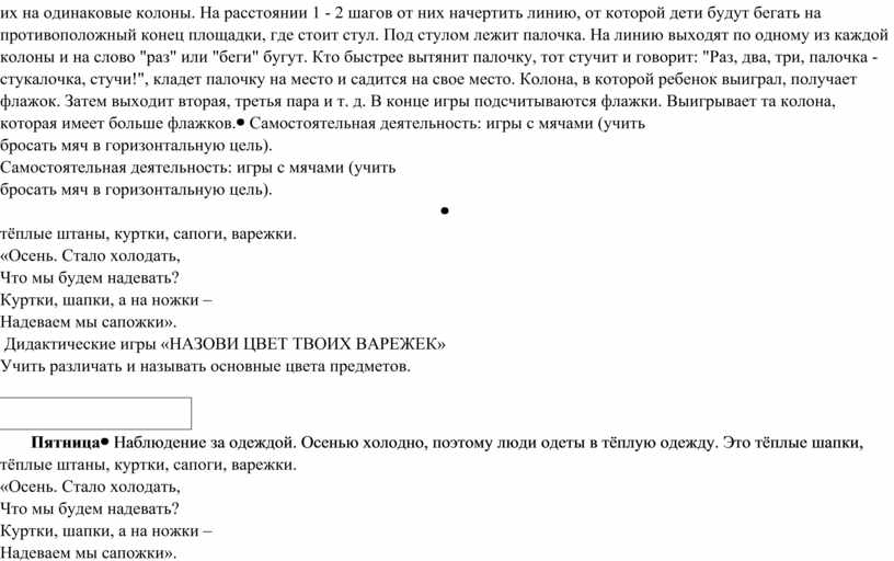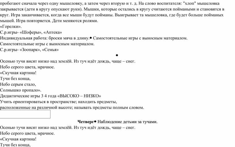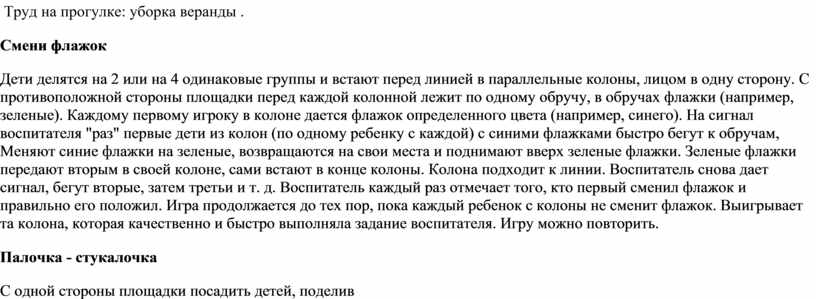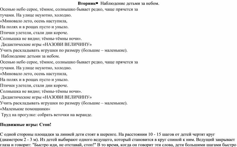 детьми за небом. «Маленькие помощники» Подвижные игры: Стоп!С одной стороны площадки за линией дети стоят в шеренге. На расстоянии 10 - 15 шагов от детей чертят круг (диаметром 2 - 3 м). Из детей выбирают одного ведущего, который становится в круг спиной к ним. Ведущий закрывает глаза и говорит: "Быстро иди, не отставай, стоп!" В то время, когда он говорит эти слова, дети большими шагами быстро идут вперед по направлению к ведущему. На слово "стоп!" все замирают на местах, ведущий быстро смотрит. Если ребенок не успел остановиться и встать ровно, ведущий снова ведет его к линии и он при повторении игры начинает двигаться снова от линии. Ведущий снова закрывает глаза и говорит те же слова, а дети дальше двигаются к ведущему в круг, и так до тех пор, пока кто - нибудь из детей не дойдет к ведущему в круг раньше, чем тот скажет "стоп!" Этот ребенок меняется местами с ведущим, и игра повторяется. Пастух и волкИз детей выбирают "пастуха" и "волка", остальные дети - "овцы". На одном конце площадки чертят "дом" для овец, на противоположной стороне площадки - поле, где будут пастись овцы. С боку стоит волк. Пастух ведет овец в поле. В поле овцы бегают, пасутся. На сигнал воспитателя: "волк!" овцы разбегаются по площадке и убегают в свой домик. Волк ловит овец. Пастух их защищает. Пойманную овцу волк отводит к себе. При повторении игры пастух, возвращаясь домой, освобождает пойманную волком овечку. Волк старается не допустить пастуха к овце и в то же время ловит остальных. Игра заканчивается, когда у волка будет несколько овечек (по договоренности). С.р.игры- «Дочки-матери», «Врачи» Индивидуальная