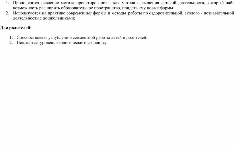 2. Продолжится освоение метода проектирования - как метода насыщения детской деятельности, который даёт возможность расширить образовательное пространство, придать ему новые формы