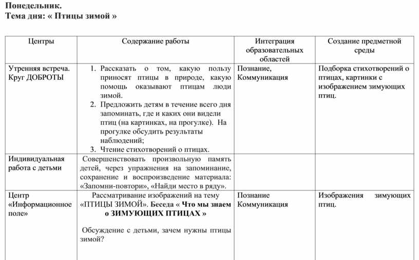 1. Рассказать о том, какую пользу приносят птицы в природе, какую помощь оказывают птицам люди зимой. 2. Предложить детям в течение всего дня запоминать, где и каких они видели птиц (на картинках, на прогулке). На прогулке обсудить результаты наблюдений; 3. Чтение стихотворений о птицах. |
