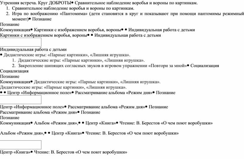 1. Сравнительное наблюдение воробья и вороны по картинкам. 2. Игра по воображению «Пантомима» (дети становятся в круг и показывают при помощи пантомимы режимный момент) |