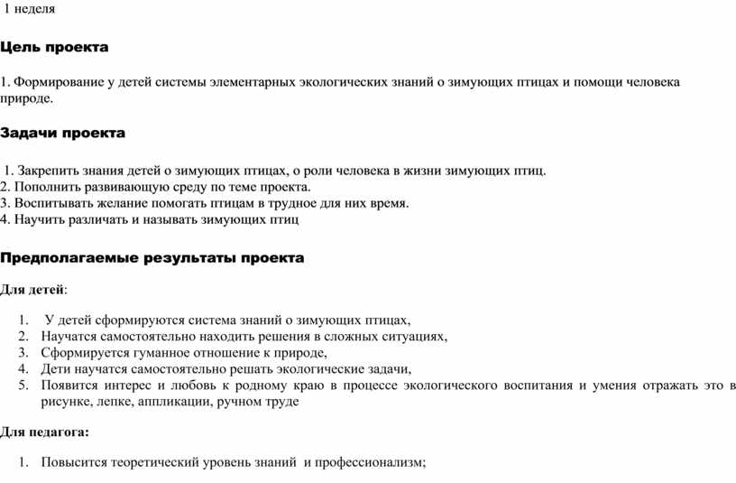 1. Формирование у детей системы элементарных экологических знаний о зимующих птицах и помощи человека природе.