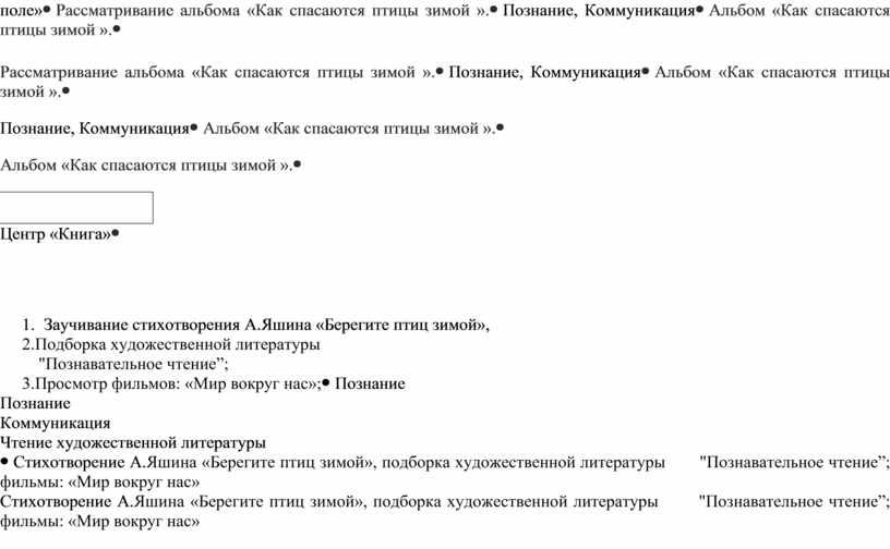 Стихотворение А.Яшина «Берегите птиц зимой», подборка художественной литературы "Познавательное чтение”; фильмы: «Мир вокруг нас»