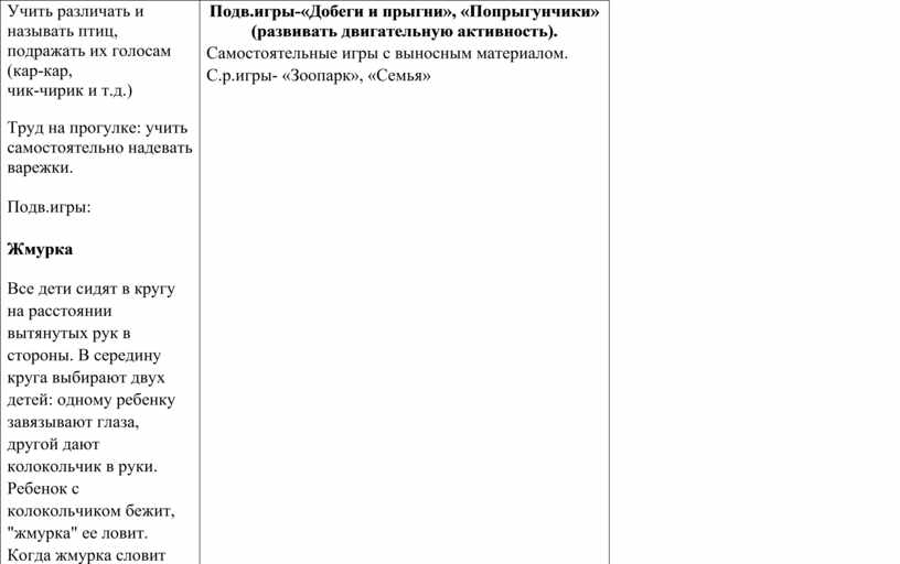 одеты в тёплую одежду. Это тёплые шапки, «КТО КАК КРИЧИТ» Труд на прогулке: учить самостоятельно надевать варежки. Подв.игры: ЖмуркаВсе дети сидят в кругу на расстоянии вытянутых рук в стороны. В середину круга выбирают двух детей: одному ребенку завязывают глаза, другой дают колокольчик в руки. Ребенок с колокольчиком бежит, "жмурка" ее ловит. Когда жмурка словит ребенка с колокольчиком, то выбирают других детей в середину круга, и игра продолжается. «Прятки» С.р.игры- «Зоопарк», «Семья» Индивидуальная работа: улучшать технику бега. |