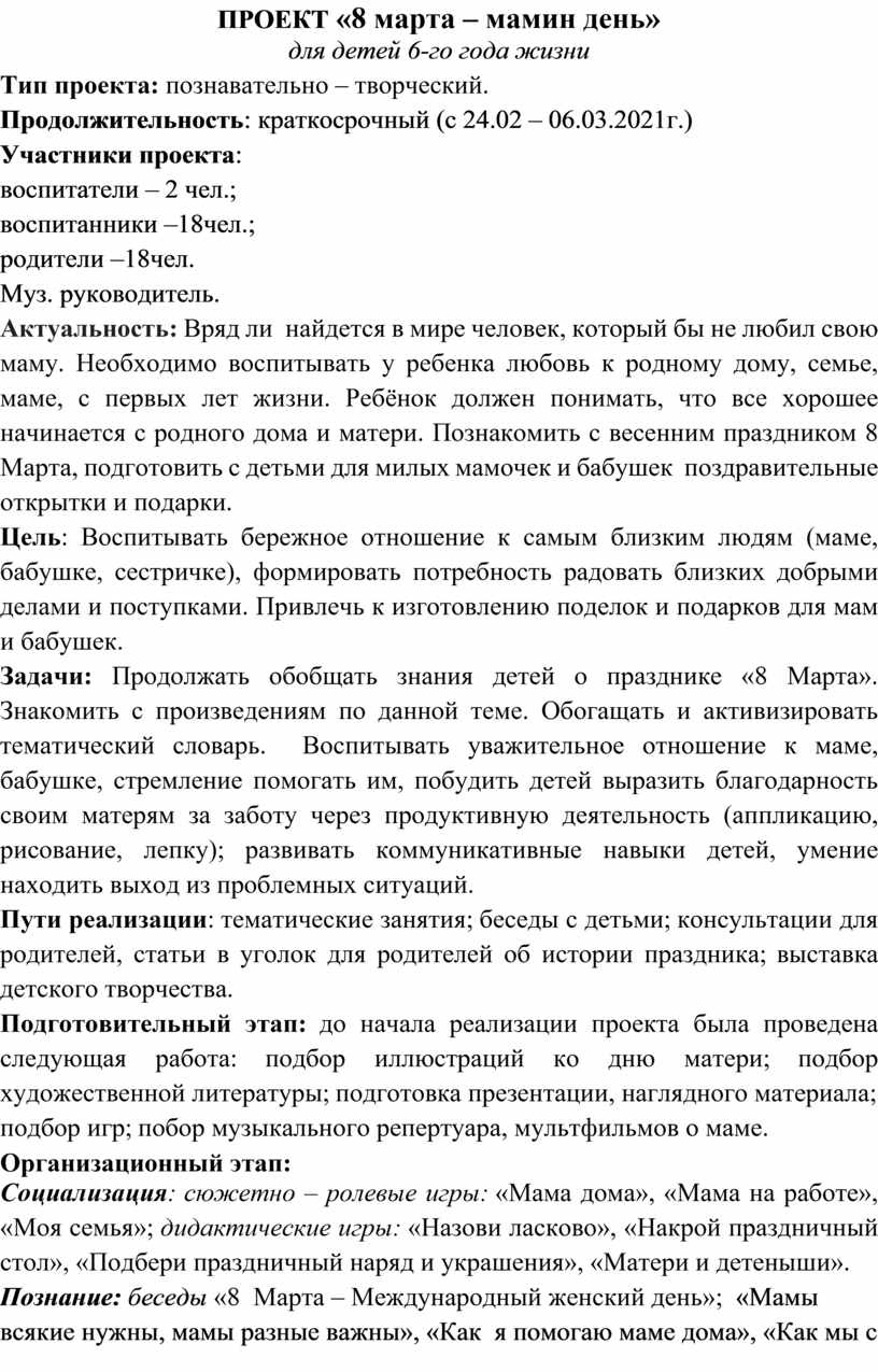 Предполагаемый результат: После завершения проекта дети получат новые знания о празднике «8 марта» в России, его традициях; познакомятся с профессиями женщин и их значимостью для других людей; научатся выразительно читать произведения о маме, анализировать их; дети составят рассказы описательного характера о своей маме и своей семье; появится желание быть похожими на близких людей в делах, поступках; появится заботливое, уважительное отношение к матери.