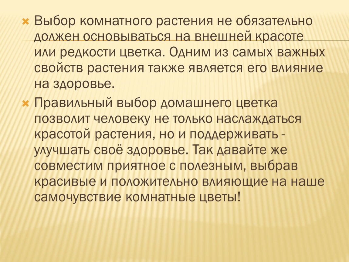 Правильный выбор домашнего цветка позволит человеку не только наслаждаться красотой растения, но и поддерживать - улучшать своё здоровье. Так давайте же совместим приятное с полезным, выбрав красивые и положительно влияющие на наше самочувствие комнатные цветы!