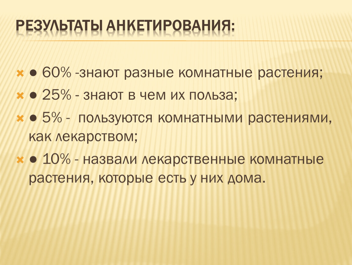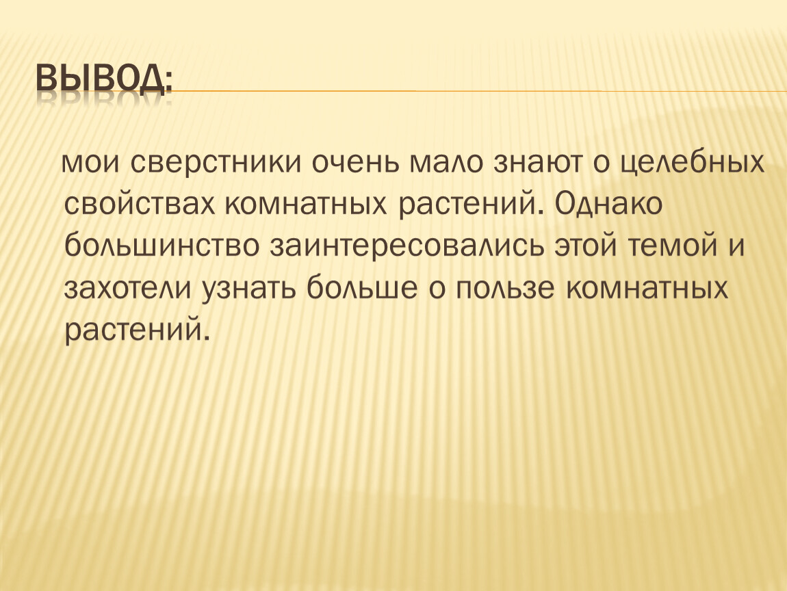 мои сверстники очень мало знают о целебных свойствах комнатных растений. Однако большинство заинтересовались этой темой и захотели узнать больше о пользе комнатных растений.