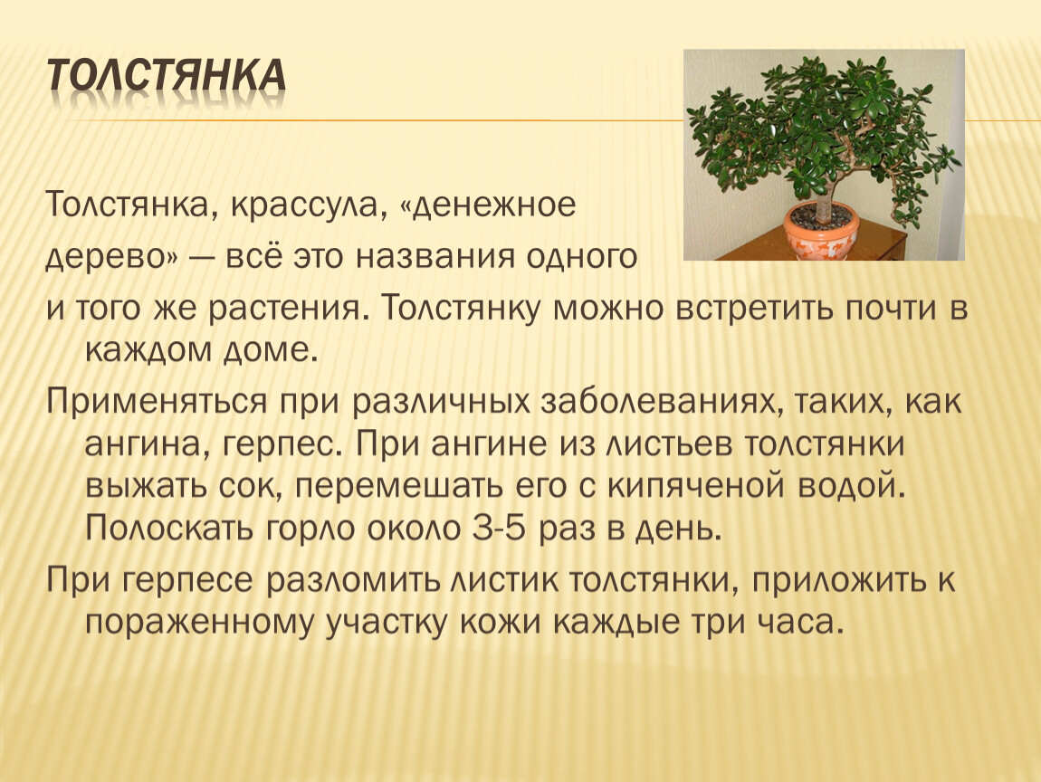 Применяться при различных заболеваниях, таких, как ангина, герпес. При ангине из листьев толстянки выжать сок, перемешать его с кипяченой водой. Полоскать горло около 3-5 раз в день.