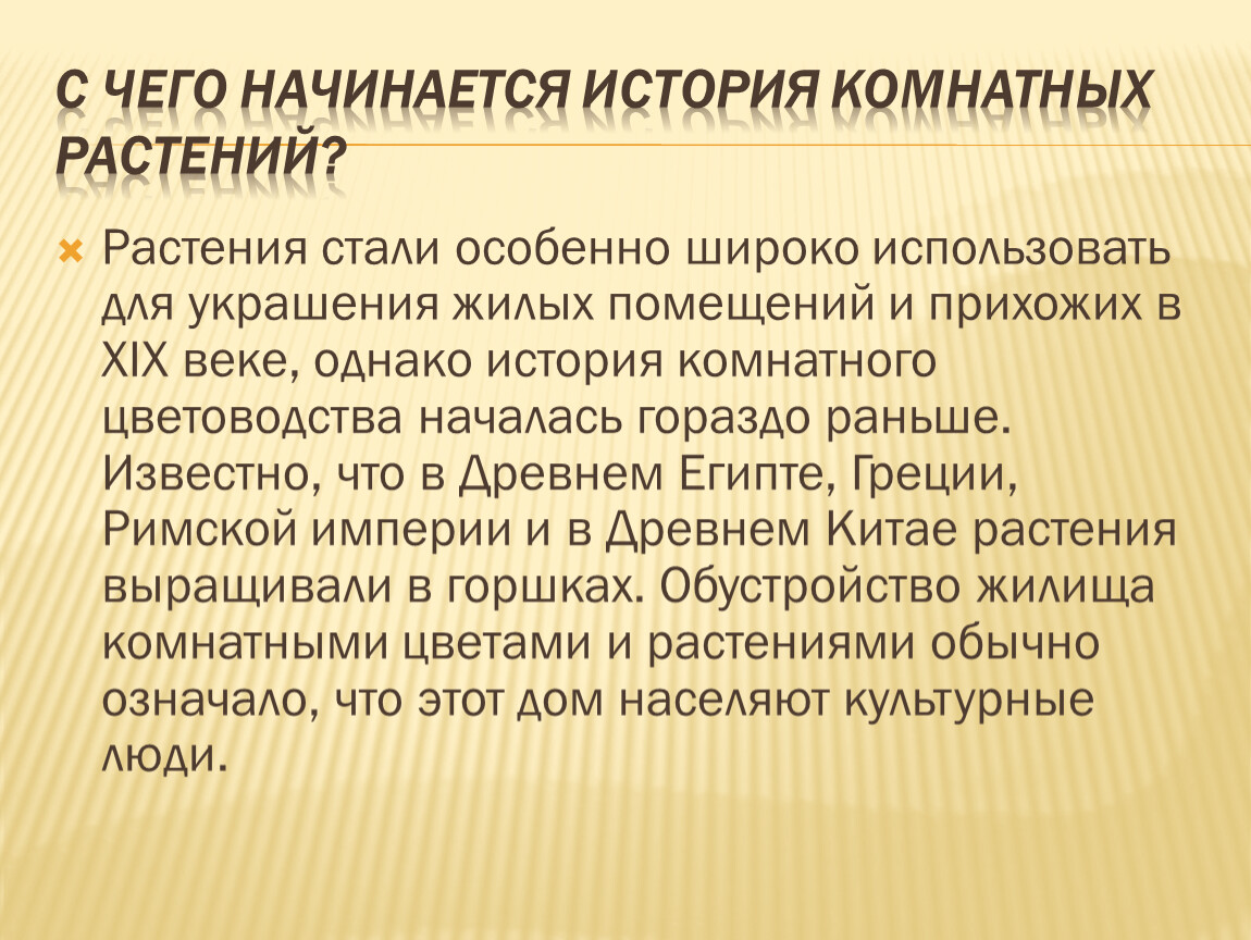Растения стали особенно широко использовать для украшения жилых помещений и прихожих в XIX веке, однако история комнатного цветоводства началась гораздо раньше. Известно, что в Древнем Египте, Греции, Римской империи и в Древнем Китае растения выращивали в горшках. Обустройство жилища комнатными цветами и растениями обычно означало, что этот дом населяют культурные люди.