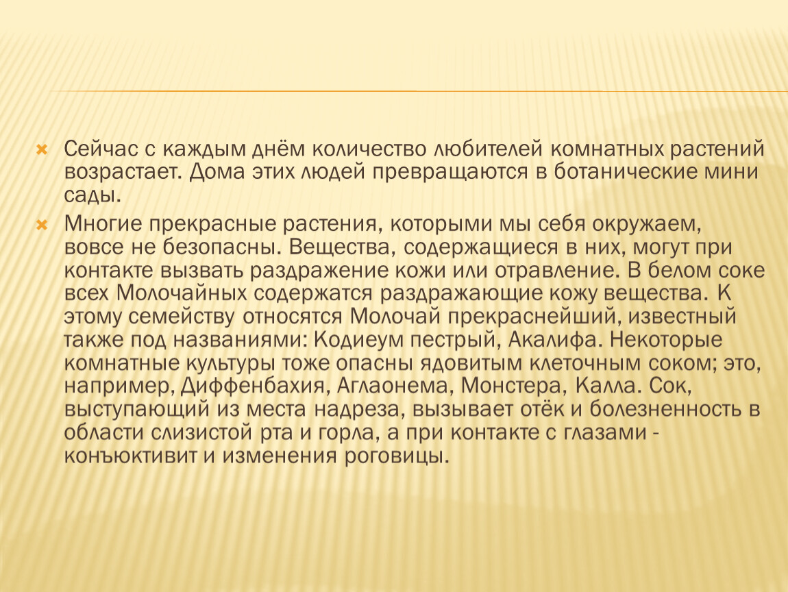 Многие прекрасные растения, которыми мы себя окружаем, вовсе не безопасны. Вещества, содержащиеся в них, могут при контакте вызвать раздражение кожи или отравление. В белом соке всех Молочайных содержатся раздражающие кожу вещества. К этому семейству относятся Молочай прекраснейший, известный также под названиями: Кодиеум пестрый, Акалифа. Некоторые комнатные культуры тоже опасны ядовитым клеточным соком; это, например, Диффенбахия, Аглаонема, Монстера, Калла. Сок, выступающий из места надреза, вызывает отёк и болезненность в области слизистой рта и горла, а при контакте с глазами - конъюктивит и изменения роговицы.