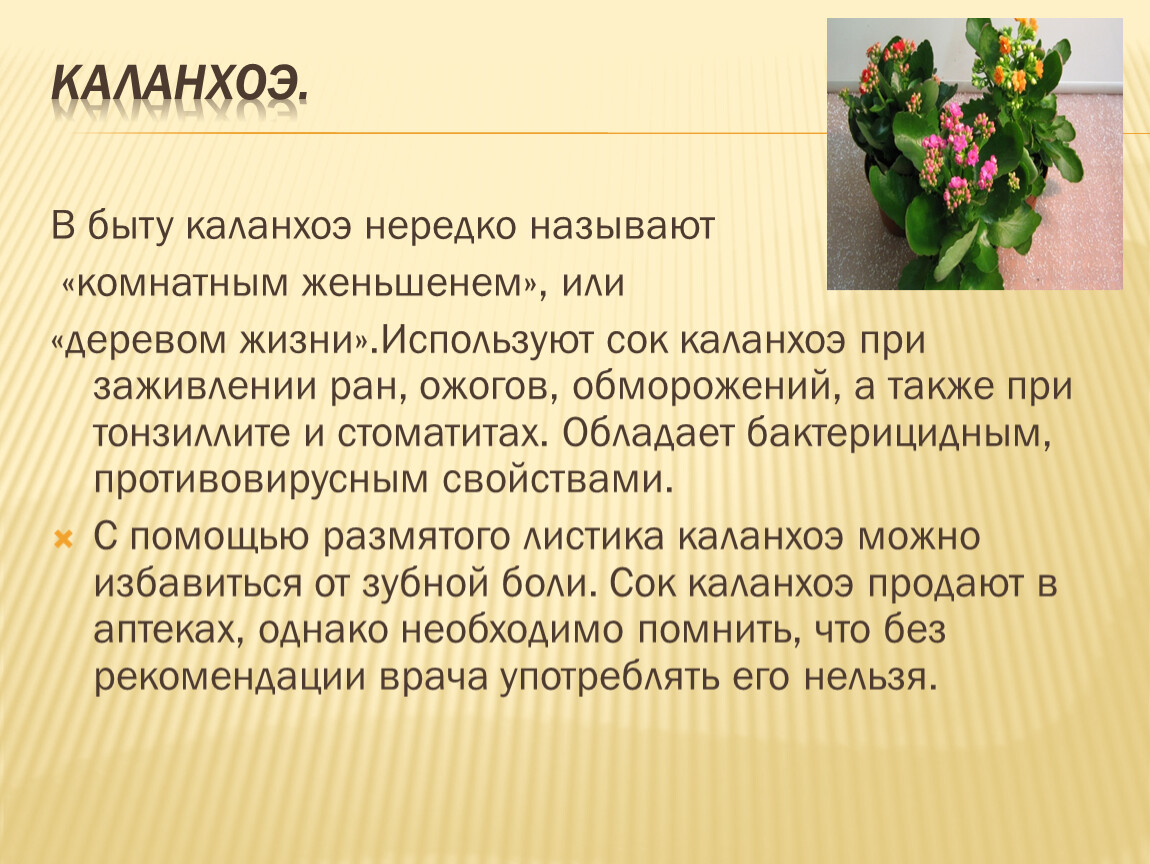 «деревом жизни».Используют сок каланхоэ при заживлении ран, ожогов, обморожений, а также при тонзиллите и стоматитах. Обладает бактерицидным, противовирусным свойствами.