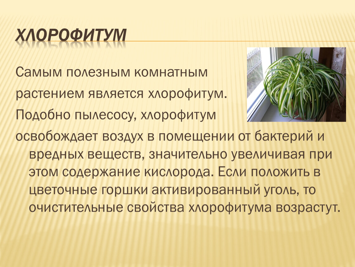 освобождает воздух в помещении от бактерий и вредных веществ, значительно увеличивая при этом содержание кислорода. Если положить в цветочные горшки активированный уголь, то очистительные свойства хлорофитума возрастут.