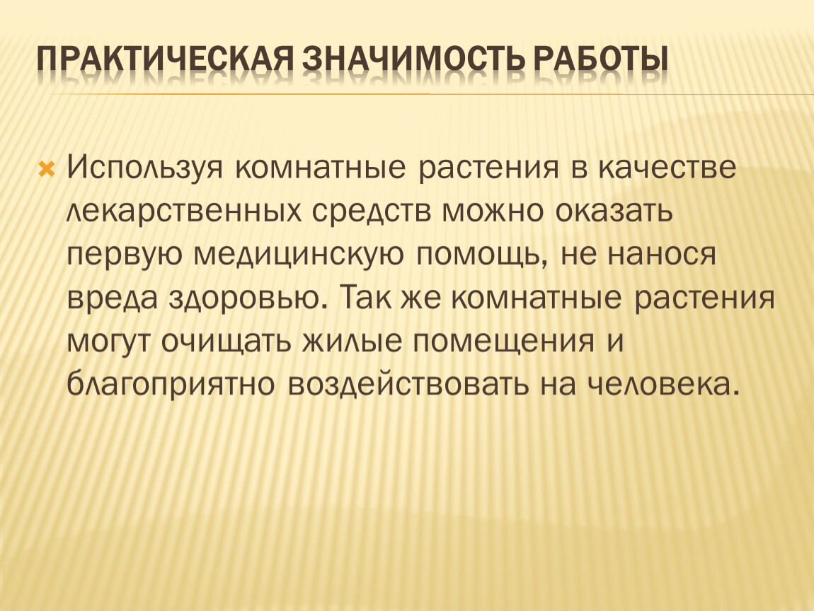 Используя комнатные растения в качестве лекарственных средств можно оказать первую медицинскую помощь, не нанося вреда здоровью. Так же комнатные растения могут очищать жилые помещения и благоприятно воздействовать на человека.