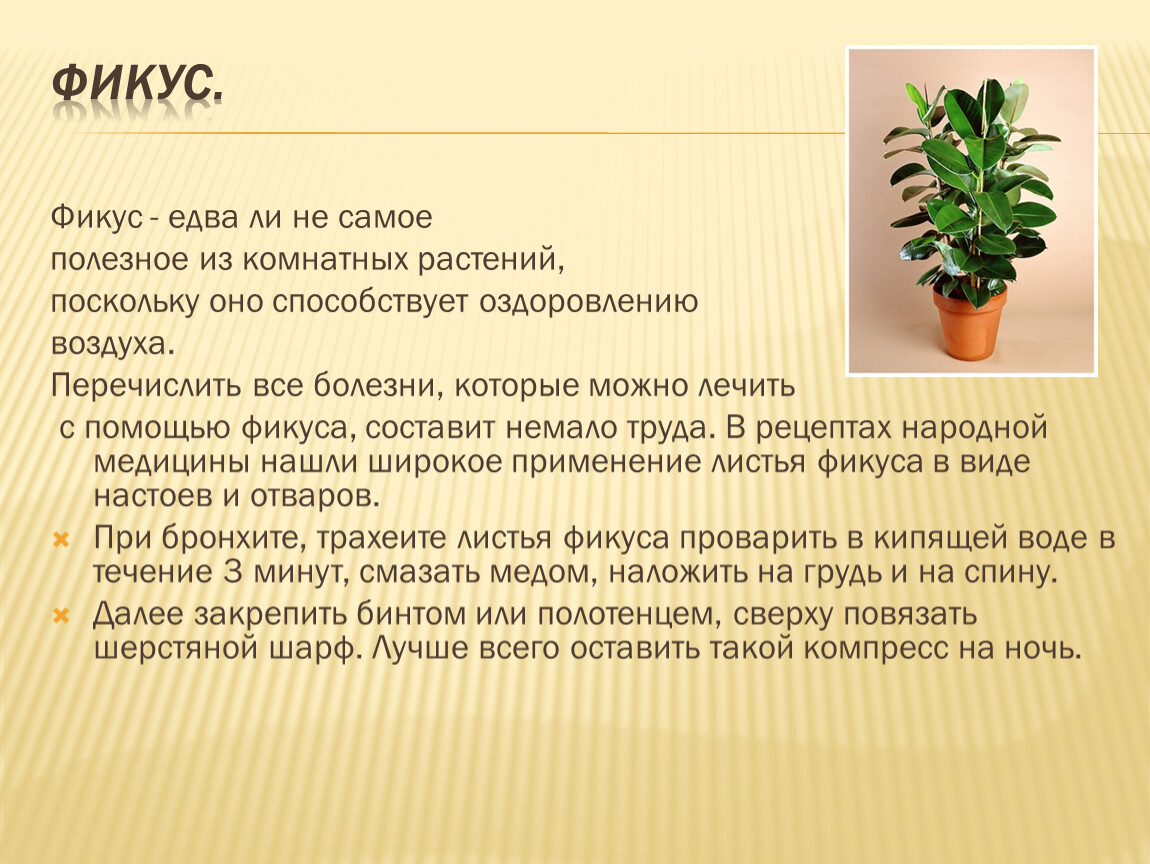с помощью фикуса, составит немало труда. В рецептах народной медицины нашли широкое применение листья фикуса в виде настоев и отваров.