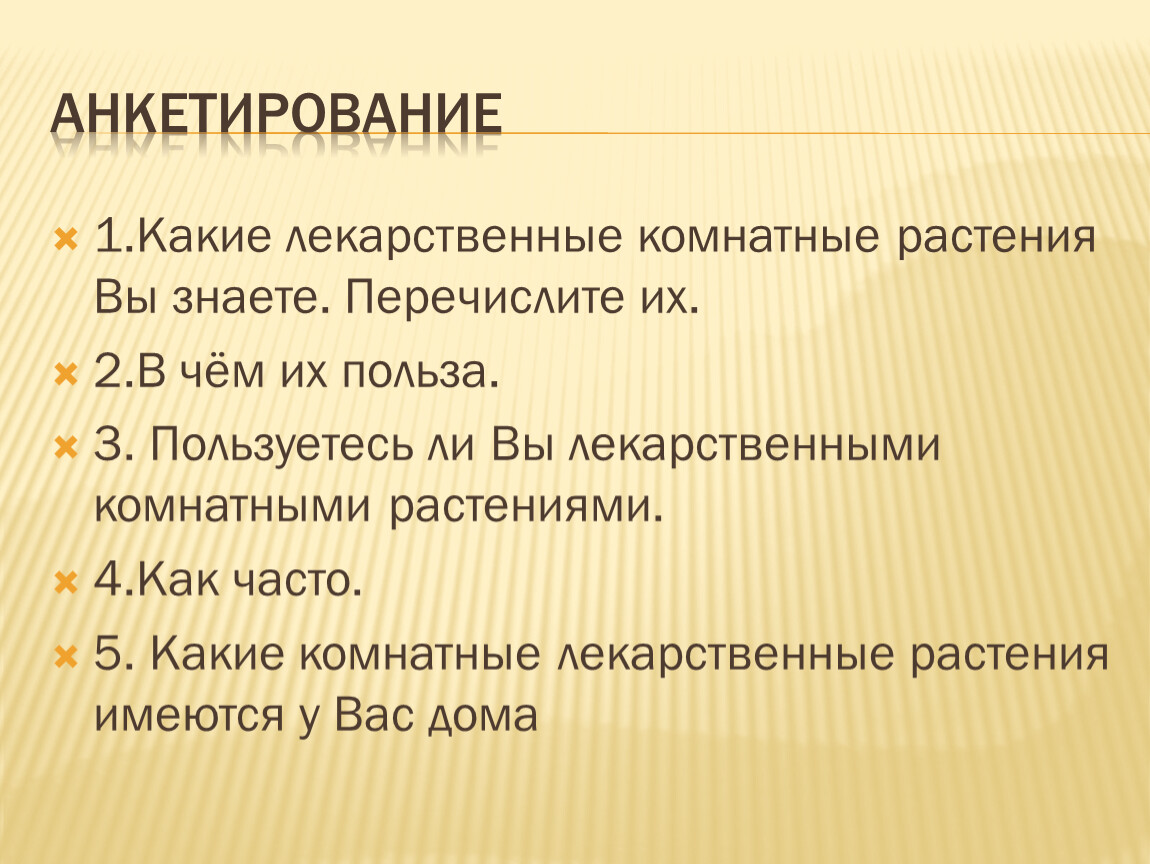 Провести опрос по знаниям названий и лечебных свойств комнатных растений;