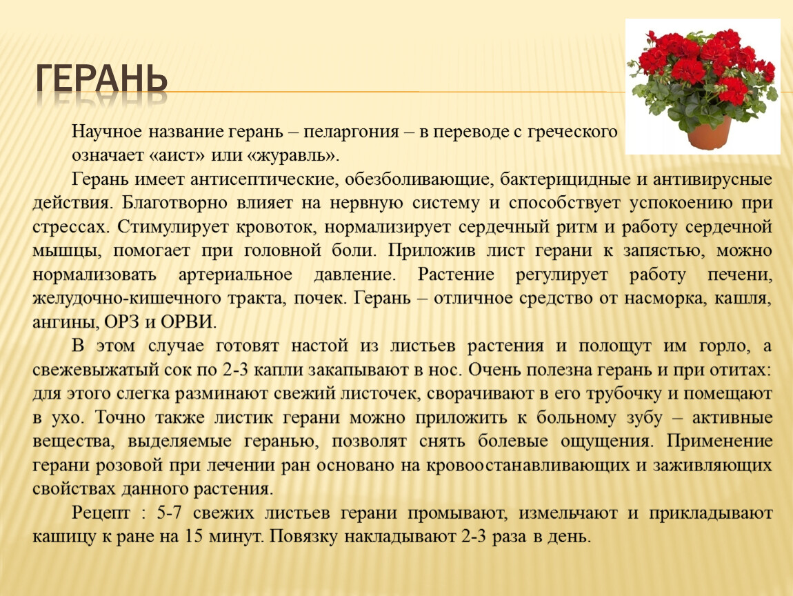 Герань имеет антисептические, обезболивающие, бактерицидные и антивирусные действия. Благотворно влияет на нервную систему и способствует успокоению при стрессах. Стимулирует кровоток, нормализирует сердечный ритм и работу сердечной мышцы, помогает при головной боли. Приложив лист герани к запястью, можно нормализовать артериальное давление. Растение регулирует работу печени, желудочно-кишечного тракта, почек. Герань – отличное средство от насморка, кашля, ангины, ОРЗ и ОРВИ.