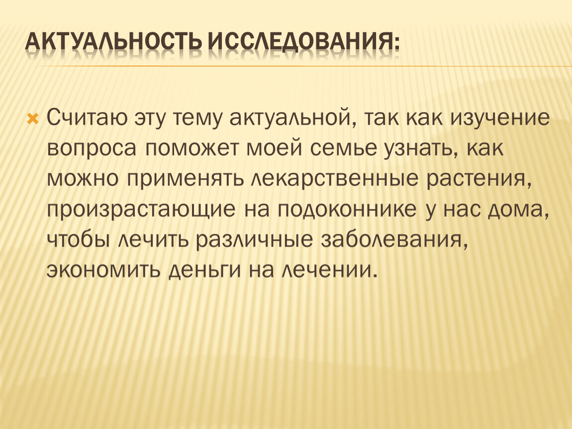 Считаю эту тему актуальной, так как изучение вопроса поможет моей семье узнать, как можно применять лекарственные растения, произрастающие на подоконнике у нас дома, чтобы лечить различные заболевания, экономить деньги на лечении.