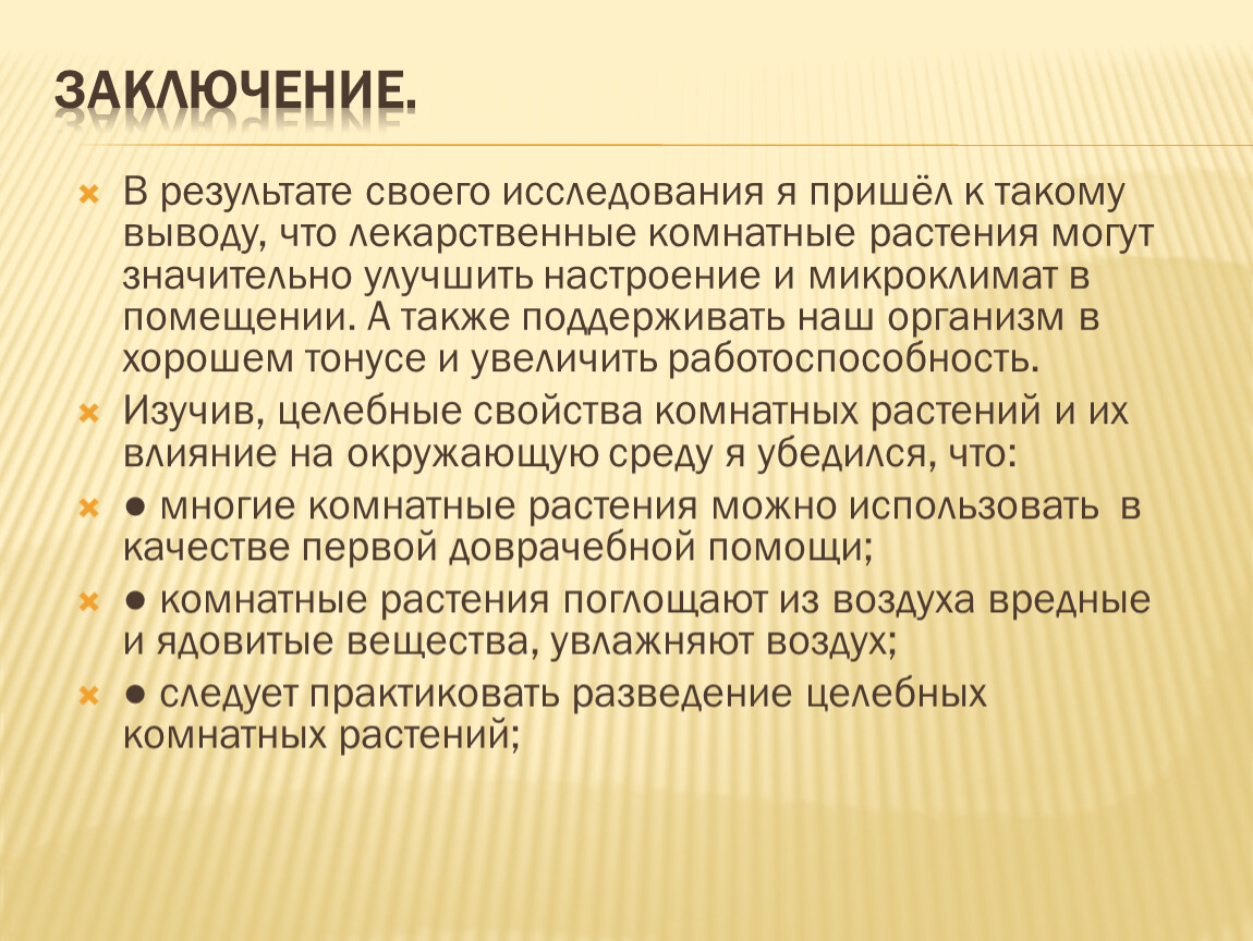 В результате своего исследования я пришёл к такому выводу, что лекарственные комнатные растения могут значительно улучшить настроение и микроклимат в помещении. А также поддерживать наш организм в хорошем тонусе и увеличить работоспособность.