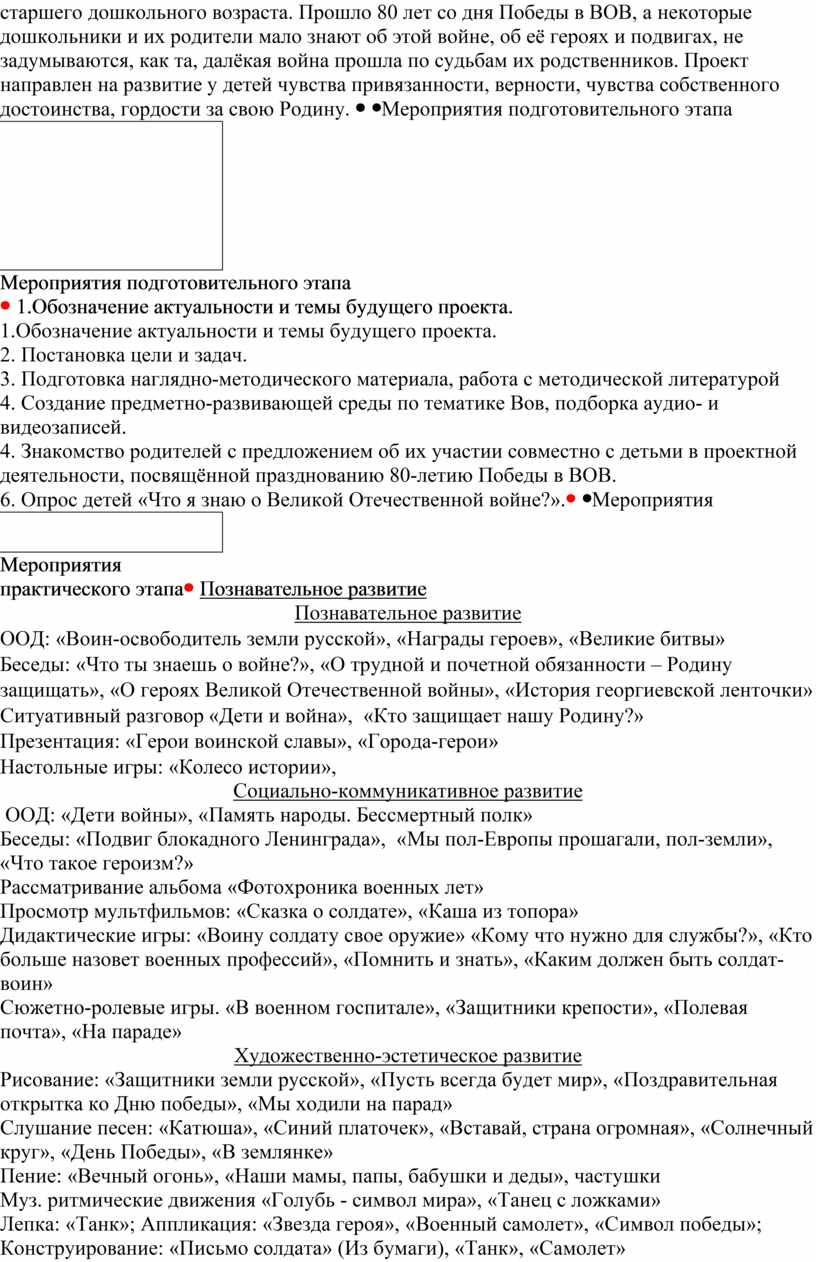 1.Обозначение актуальности и темы будущего проекта. 2. Постановка цели и задач. 3. Подготовка наглядно-методического материала, работа с методической литературой 4. Создание предметно-развивающей среды по тематике Вов, подборка аудио- и видеозаписей. 4. Знакомство родителей с предложением об их участии совместно с детьми в проектной деятельности, посвящённой празднованию 80-летию Победы в ВОВ. 6. Опрос детей «Что я знаю о Великой Отечественной войне?». |