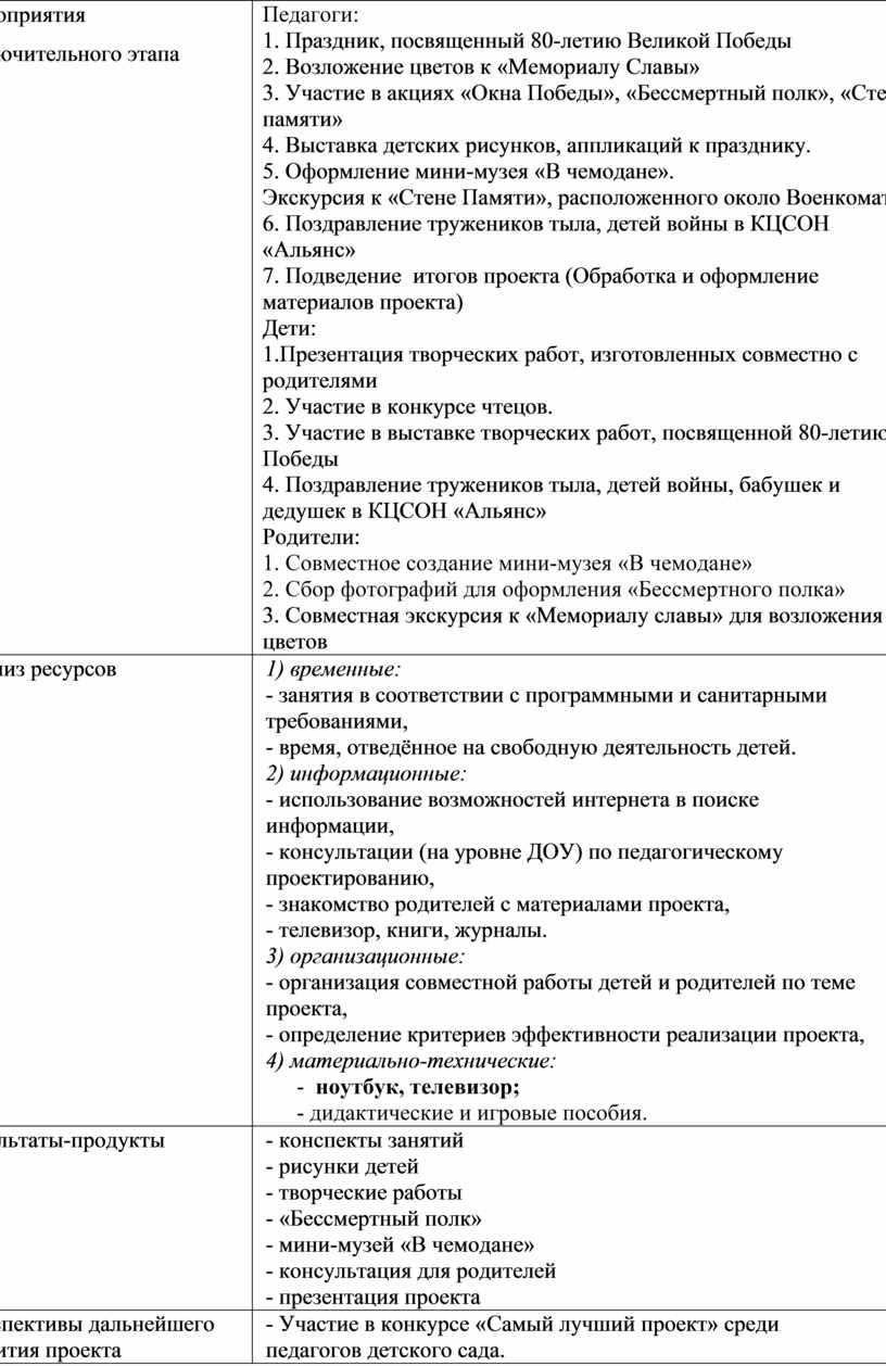Педагоги: 1. Праздник, посвященный 80-летию Великой Победы 2. Возложение цветов к «Мемориалу Славы» 3. Участие в акциях «Окна Победы», «Бессмертный полк», «Стена памяти» 4. Выставка детских рисунков, аппликаций к празднику. 5. Оформление мини-музея «В чемодане». Экскурсия к «Стене Памяти», расположенного около Военкомата. 6. Поздравление тружеников тыла, детей войны в КЦСОН «Альянс» 7. Подведение итогов проекта (Обработка и оформление материалов проекта) Дети: 1.Презентация творческих работ, изготовленных совместно с родителями 2. Участие в конкурсе чтецов. 3. Участие в выставке творческих работ, посвященной 80-летию Победы 4. Поздравление тружеников тыла, детей войны, бабушек и дедушек в КЦСОН «Альянс» Родители: 1. Совместное создание мини-музея «В чемодане» 2. Сбор фотографий для оформления «Бессмертного полка» 3. Совместная экскурсия к «Мемориалу славы» для возложения цветов |