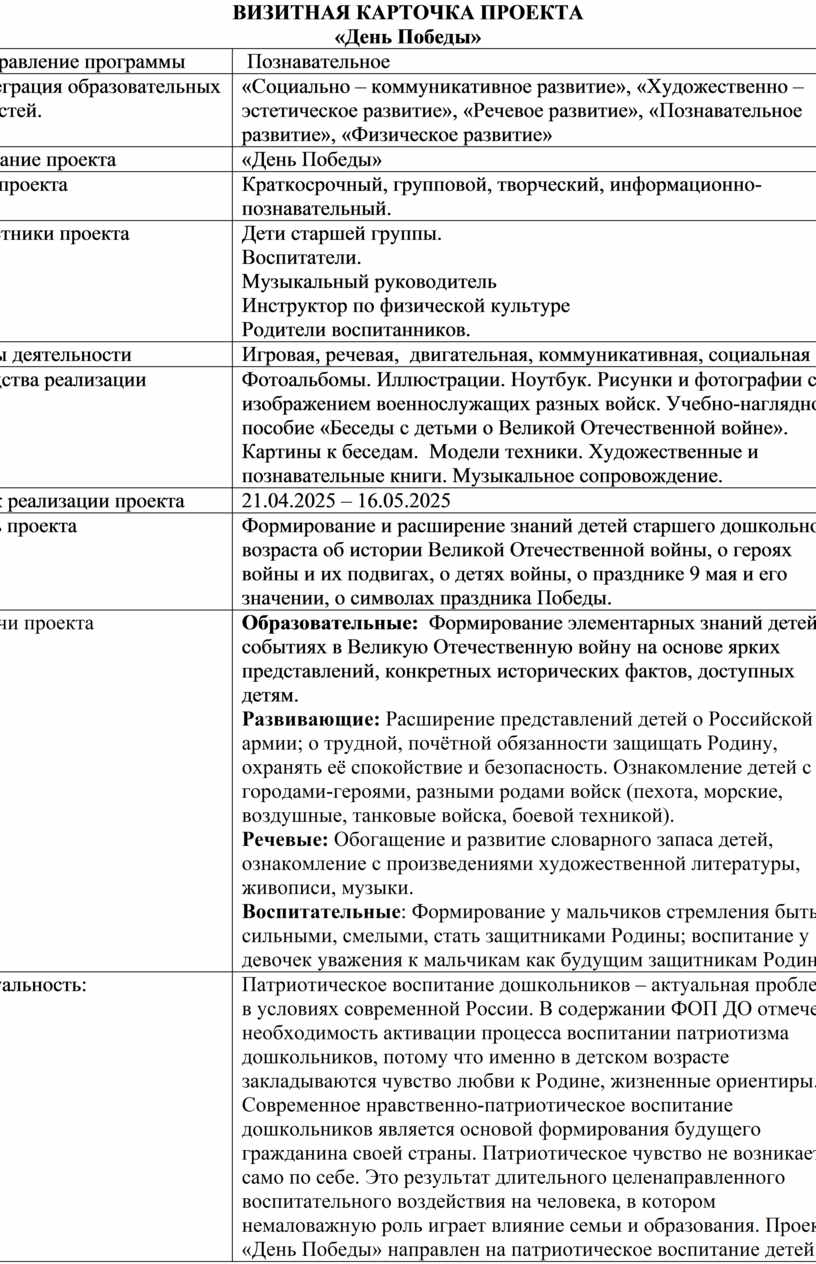 Патриотическое воспитание дошкольников – актуальная проблема в условиях современной России. В содержании ФОП ДО отмечена необходимость активации процесса воспитании патриотизма дошкольников, потому что именно в детском возрасте закладываются чувство любви к Родине, жизненные ориентиры. Современное нравственно-патриотическое воспитание дошкольников является основой формирования будущего гражданина своей страны. Патриотическое чувство не возникает само по себе. Это результат длительного целенаправленного воспитательного воздействия на человека, в котором немаловажную роль играет влияние семьи и образования. Проект «День Победы» направлен на патриотическое воспитание детей старшего дошкольного возраста. Прошло 80 лет со дня Победы в ВОВ, а некоторые дошкольники и их родители мало знают об этой войне, об её героях и подвигах, не задумываются, как та, далёкая война прошла по судьбам их родственников. Проект направлен на развитие у детей чувства привязанности, верности, чувства собственного достоинства, гордости за свою Родину. |