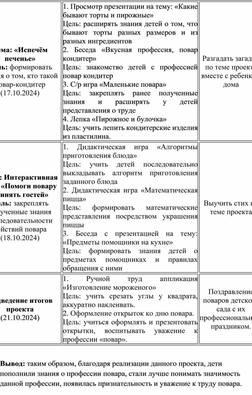 Вывод: таким образом, благодаря реализации данного проекта, дети пополнили знания о профессии повара, стали лучше понимать значимость данной профессии, появилась признательность и уважение к труду повара.