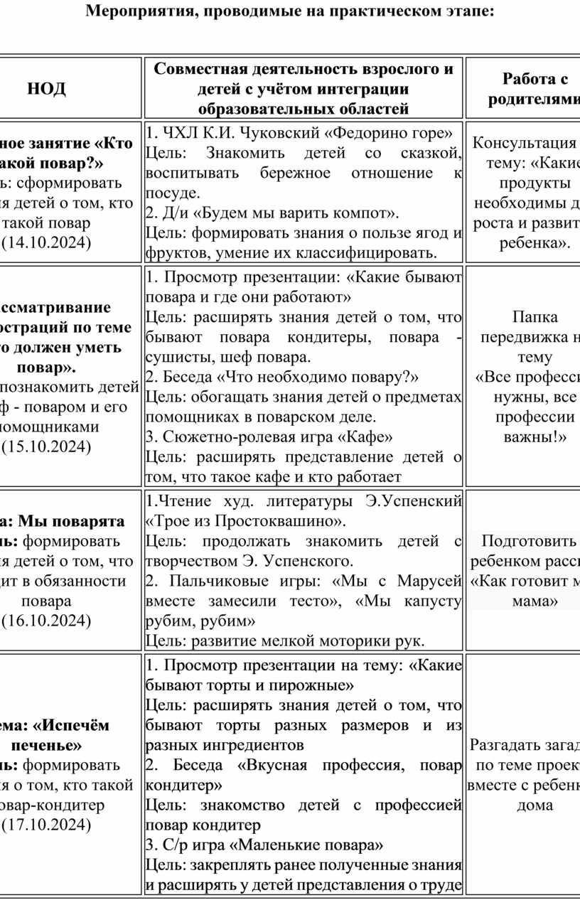 Тема: Мы поварята Цель: формировать знания детей о том, что входит в обязанности повара (16.10.2024) |