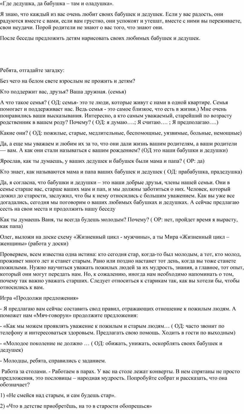 Да, я согласна, что бабушки и дедушки – это наши добрые друзья, члены нашей семьи. Они в семье старше вас, старше ваших мам и пап, и мы должны заботиться о них. Человек, который дожил до старости, заслужил, что бы к нему относились с большим уважением. Как вы уже все догадались, сегодня мы поговорим о ваших любимых бабушках и дедушках. А сейчас предлагаю сесть на свои места и продолжить нашу беседу
