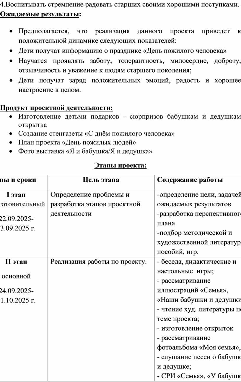 Среда (24 сентября) Составление плана проекта «Мозговой штурм» совместно с детьми Беседа «Наши бабушки и дедушки» (Приложение 1) Рассматривание иллюстраций «Семья» Дидактическая игра «Моя семья» Четверг (25 сентября) Чтение художеств. литературы: Л. Толстой «Рассказы для маленьких детей». «Моя бабушка» Беседа «Старость надо уважать» (Приложение 1) Рассматривание иллюстраций «Наши бабушки и дедушки» Пальчиковая гимнастика «Семья» Составление рассказов «В гостях у бабушки» Пятница (26 сентября) Слушание музыкальных произведений : «Бабушка рядышком с дедушкой» Создание стен газеты Чтение худ.литературы : С.Капутикян, «Мой дедушка» Понедельник (29 сентября) Чтение худ.литературы : Р.Гамзатов, «Бабушкины руки» Подготовка открыток бабушке/дедушке СРИ «Семья» Слушание музыкальных произведений: Л.Некрасовой; «Для бабушек и дедушек» Вторник (30 сентября ) Создание фото выставки «Я и бабушка/Я и дедушка» Рассматривание фото альбома «Моя семья» Среда (1 октября) Слушание муз.произведений: Е.Курячий; «Милые бабушки, дедушки» сл. Е.Кислициной Составление рассказов «Моя бабушка/дедушка…» |